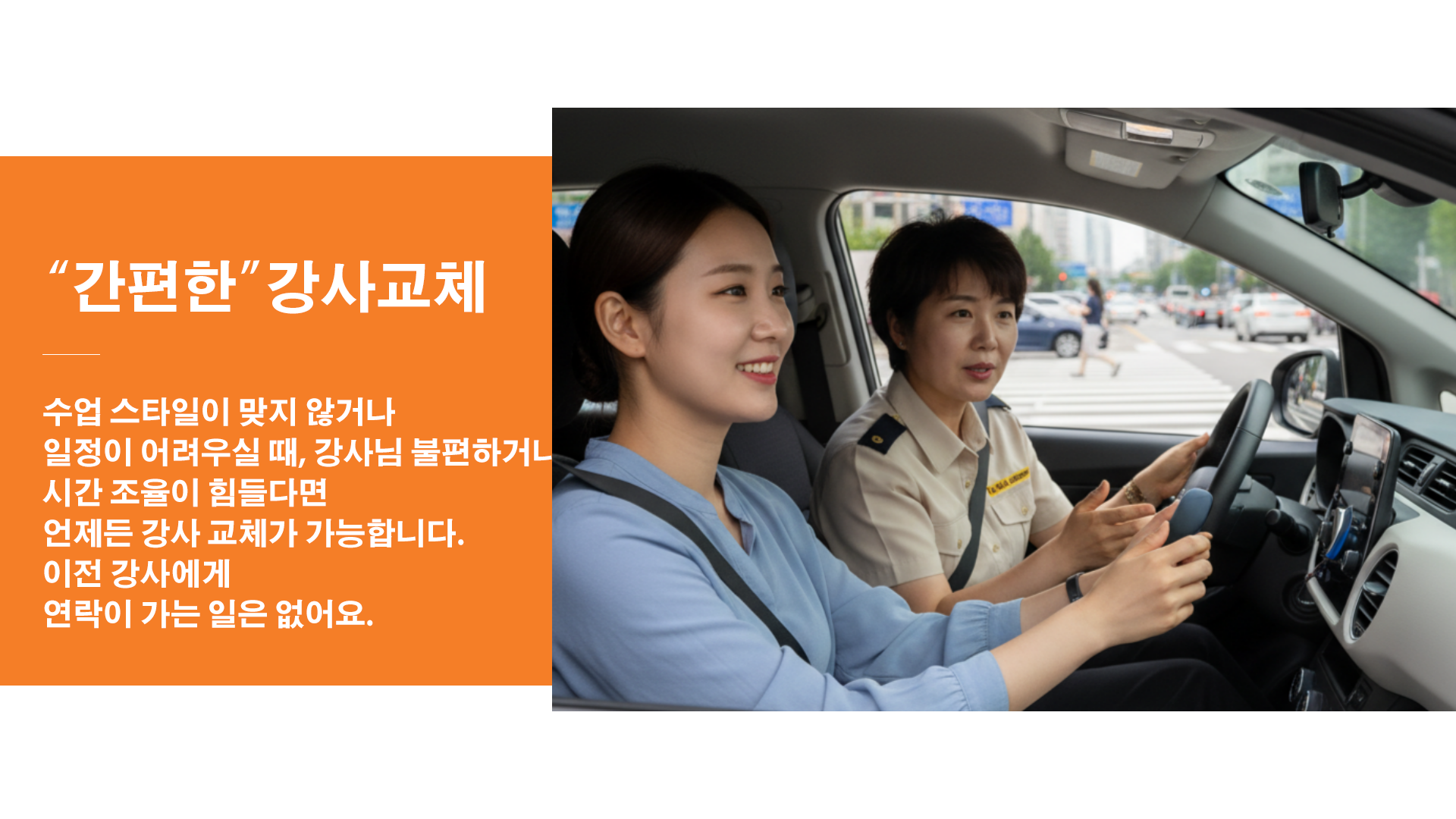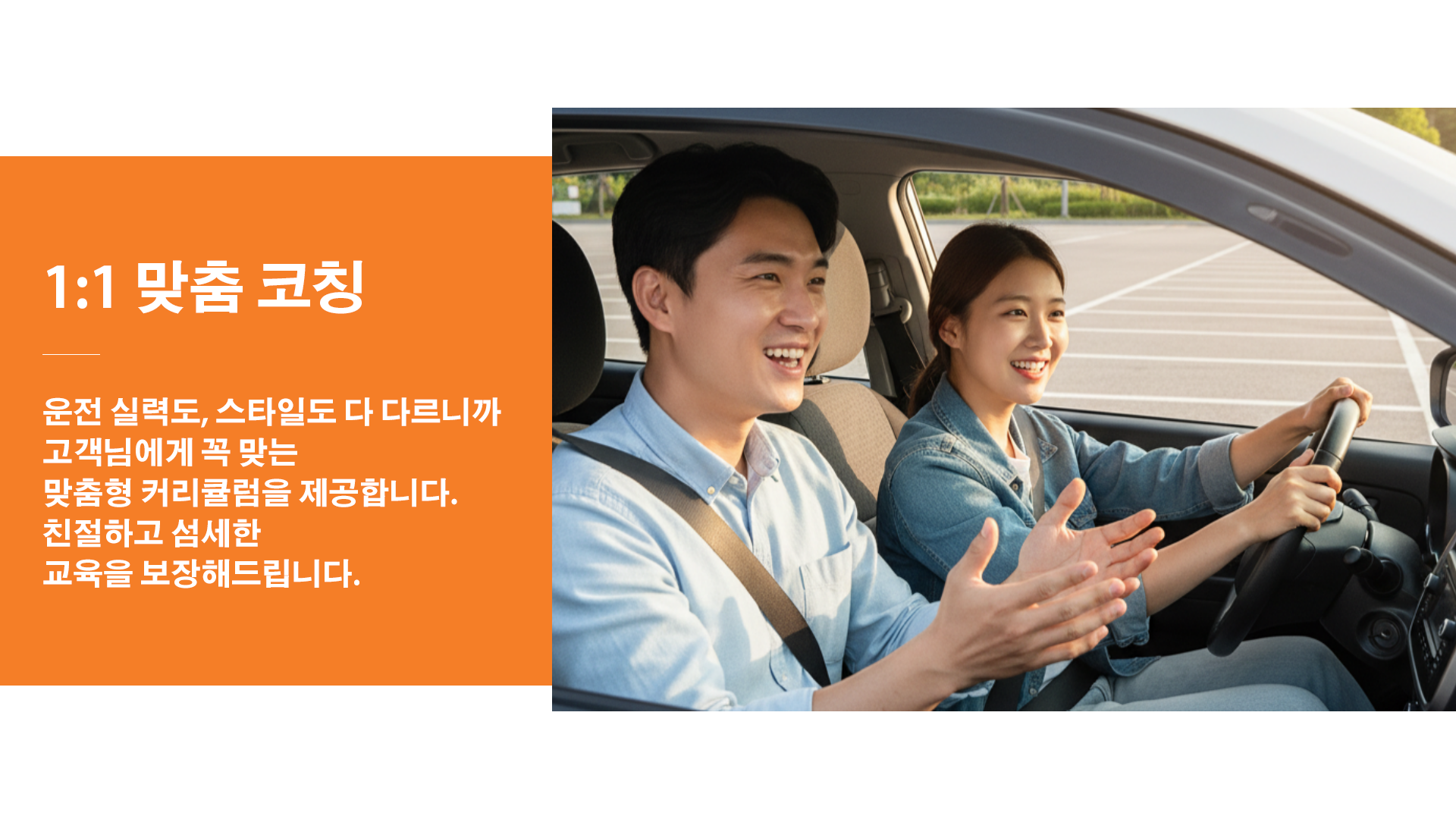 기본은 보조브레이크가 설치된 연수차량으로 진행되고, 원하면 자차 연수도 가능합니다. 자차 이용 시에는 안전장치·보험 조건을 확인해야 해요.